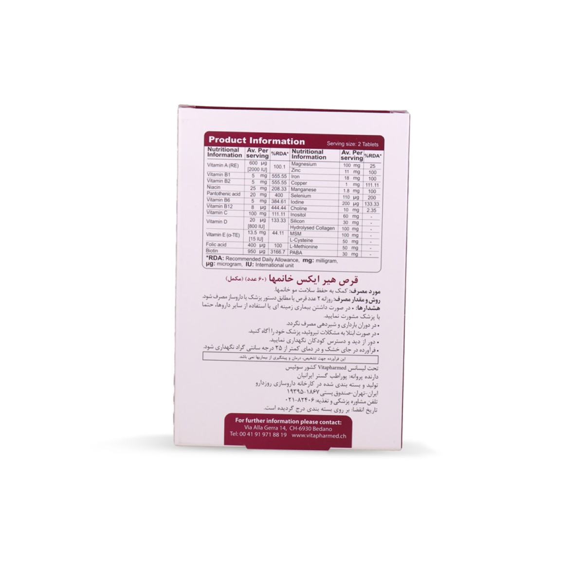قرص هیرایکس بانوان ویواتیون، مـکمل غذایی جـهت تغذیه فـولیکول های مو و یک ترکیب دقیق از ویتامین ها، مواد معدنی و آمینو اسیدهاست.این فرمول حاوی بیوتین، سلنیوم و روی است که به حفظ موهای نرمال و سالم کمک می کند. مس نیز به حفظ رنگ مو کمک می کند.