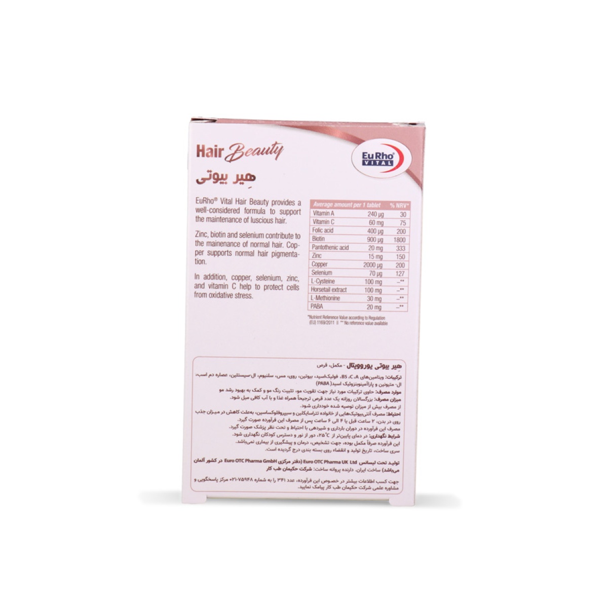 قرص هیر بیوتی یوروویتال حاوی آمینو اسیدهای ال- سیستئین و ال- متیونین، عصاره گیاه دم اسبی، پابا، ویتامین‌ها و مواد معدنی مورد نیاز برای تقویت مو است.